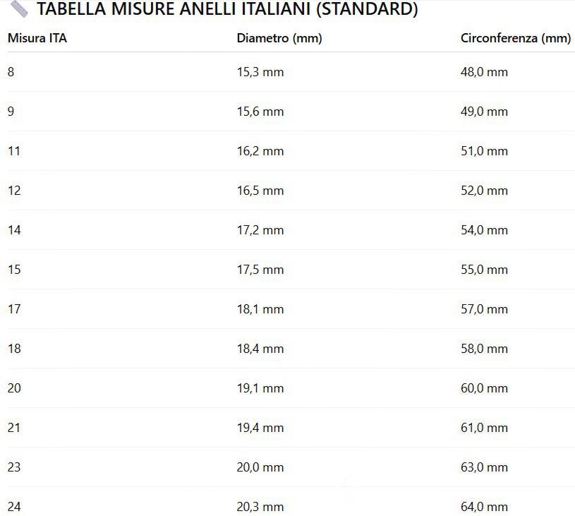 💡 Consiglio: misura il dito la sera, quando è leggermente più gonfio, per evitare che l’anello risulti stretto.